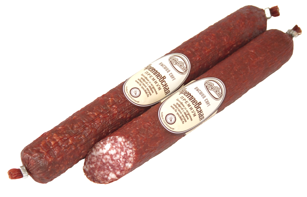 Состав: говядина, шпик хребтовый, свинина, мясо птицы, растительный белок, посолочная смесь, аскорбиновая кислота, усилитель вкуса и аромата, регулятор кислотности, красители, сахар, перец черный молотый, орех мускатный молотый, перец красный молотый.