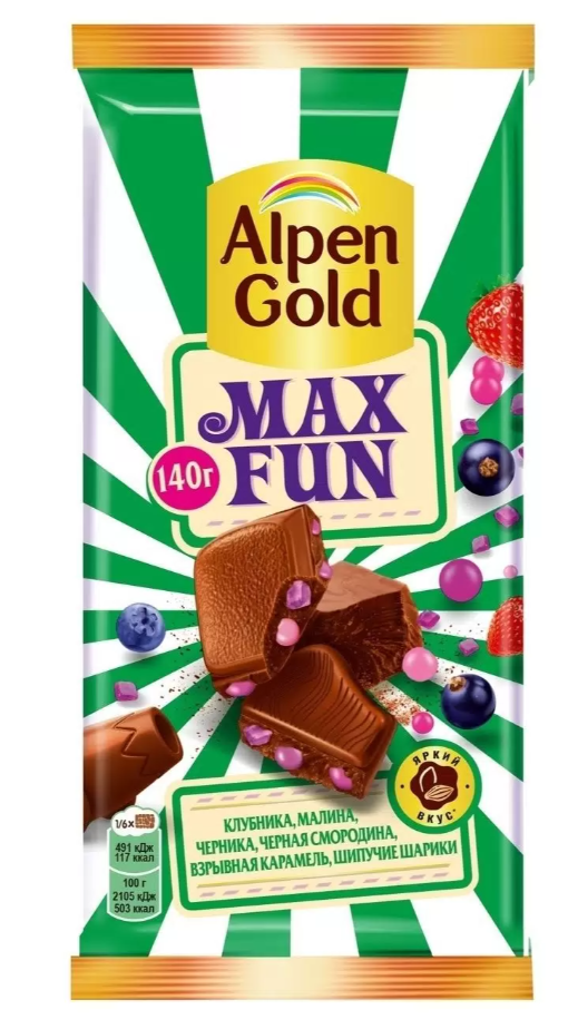 Шоколад ALPEN GOLD "Max Fun" молочный с клубникой, малиной, черникой, черной смородиной, взрывной карамелью и шипучими шариками 140 г