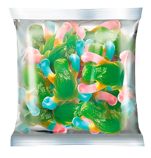 Состав: глюкозно-фруктозный сироп, сахар, желатин, концентрированный яблочный сок, регулятор кислотности лимонная кислота, желирующий агент - пектины, глазирователь (глазирователи: воск карнаубский, воск пчелиный; антиокислители: альфа-Токоферол, аскорбилпальмитат), красители: каротины, кармины, уголь растительный, медные комплексы хлорофиллинов, куркумин; ароматизаторы.