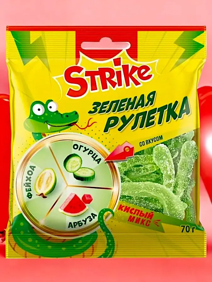 Мармелад жевательный Strike Зеленая рулетка» со вкусом Фейхоа, Огурца, Арбуза, в кислой обсыпке 70г