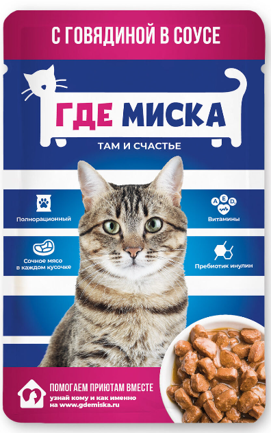 ГДЕ МИСКА? для взрослых кошек с говядиной в соусе 75 г